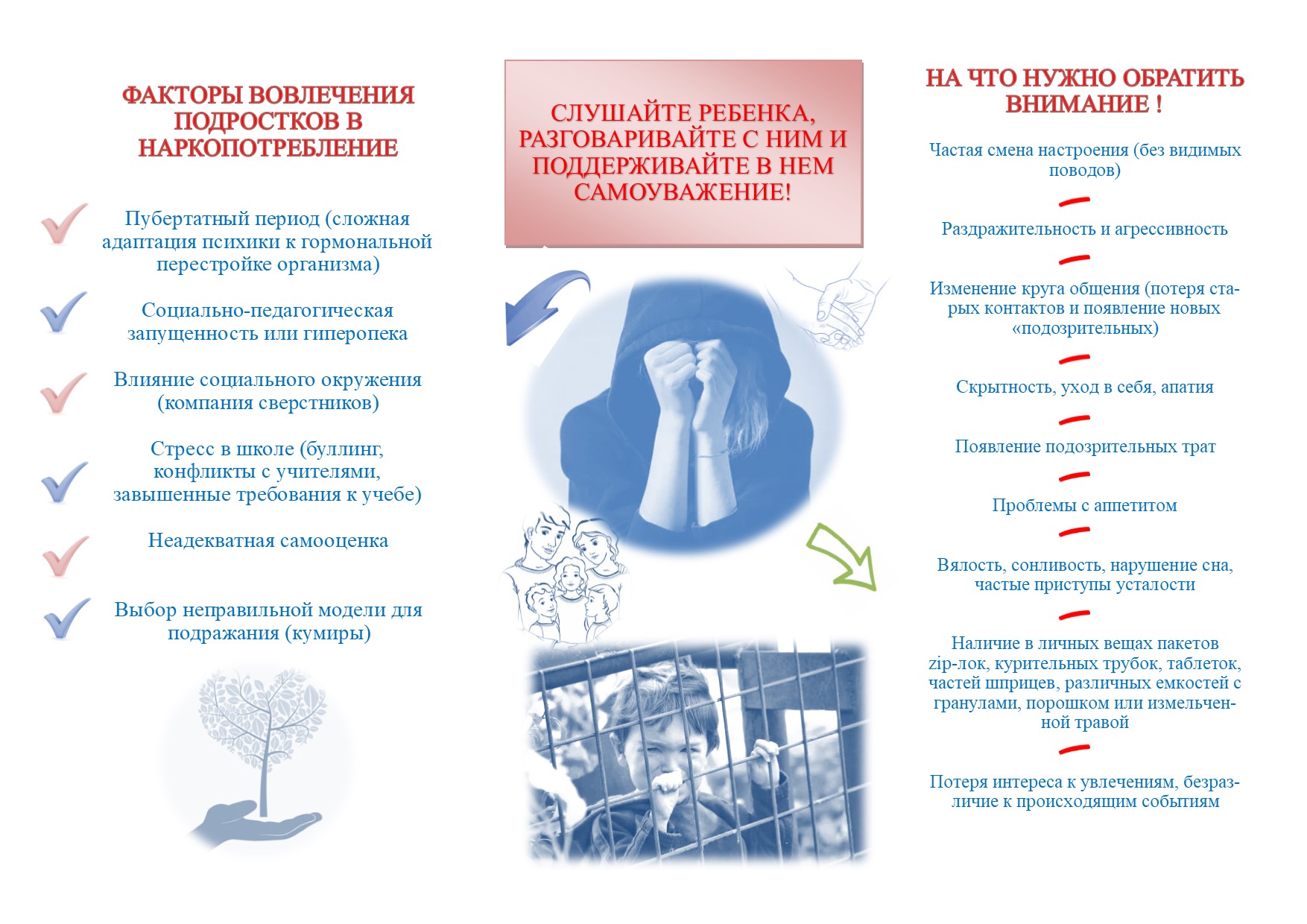 Государственная политика в сфере оборота наркотических средств, психотропных веществ и в области противодействия их незаконному обороту направлена на установление строгого контроля за оборотом наркотических средств, психотропных веществ, на постепенное сокращение числа больных наркоманией, а также на сокращение количества правонарушений, связанных с незаконным оборотом наркотических средств, психотропных веществ. Согласно ст.40 Федерального закона России «О наркотических средствах и психотропных веществах» в Российской Федерации запрещается потребление наркотических средств или психотропных веществ без назначения врача. В уголовном кодексе России, в разделе преступления против здоровья населения и общественной нравственности 9 статей, которые определяют степень ответственности лица, причастного к незаконному обороту наркотиков. Статья 228. Незаконные приобретение, хранение, перевозка, изготовление, переработка наркотических средств, психотропных веществ или их аналогов – наказывается лишением свободы на срок до 3 лет. Статья 228.1. Незаконные производство, сбыт или пересылка наркотических средств, психотропных веществ или их аналогов- наказывается лишением свободы на срок от 4 до 20 лет. Статья 228.2. Нарушение правил оборота наркотических средств или психотропных веществ - наказывается лишением свободы на срок до 3 лет. Статья 229. Хищение либо вымогательство наркотических средств или психотропных веществ - наказывается лишением свободы на срок от 3 до 15 лет. Статья 230. Склонение к потреблению наркотических средств или психотропных веществ - наказывается лишением свободы на срок от 5 до 12 лет. Статья 231. Незаконное культивирование запрещенных к возделыванию растений, содержащих наркотические вещества - наказывается лишением свободы на срок от 2 до 8 лет. Статья 232. Организация либо содержание притонов для потребления наркотических средств или психотропных веществ - наказывается лишением свободы на срок от 4 до 7 лет. Статья 233. Незаконная выдача либо подделка рецептов или иных документов, дающих право на получение наркотических средств или психотропных веществ - наказывается лишением свободы на срок до 3 лет. Статья 234. Незаконный оборот сильнодействующих или ядовитых веществ в целях сбыта - наказывается лишением свободы на срок от 3 до 8 лет. Не подвергай себя и своих близких опасности, веди здоровый образ жизни - здоровым все здорово! Ты - человек! А это звучит гордо! Зачем подвергать себя опасности быть задержанному и привлеченному к уголовной ответственности сотрудниками правоохранительных органов, находясь на дискотеке или проводя досуг в другом месте употребляя наркотики, либо совершая с ними какие - либо незаконные действия - когда вокруг масса способов выплеснуть избыток адреналина и энергии. Это страстный и зажигательный танец, увлекательная беседа, боулинг, бильярд и другие игры, наконец возможность приятно и вкусно покушать. В Кодексе РФ об административных правонарушениях предусмотрено 8 составов административных правонарушений, связанных с незаконным оборотом наркотиков. Ст.6.8- незаконное потребление, хранение, перевозка, изготовление, переработка без цели сбыта наркотических средств и психотропных веществ - штраф до 10 МРОТ или административный арест до 15 суток. Ст.6.9- потребление наркотических средс