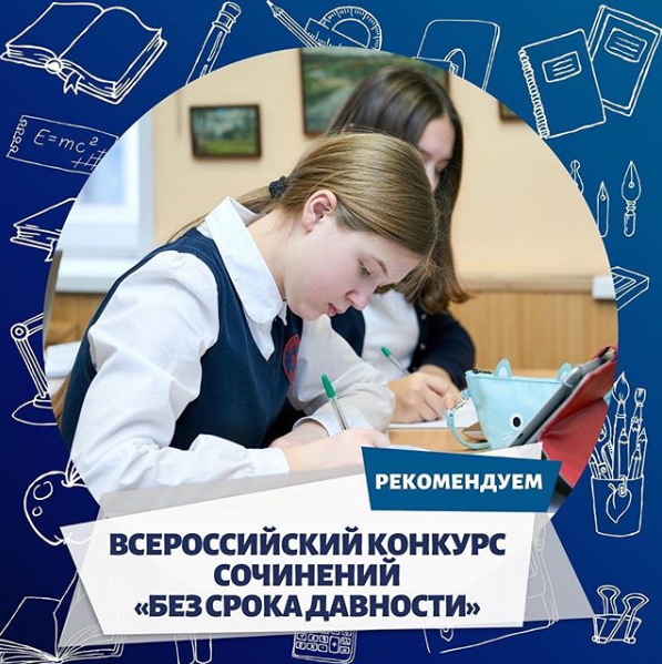 11.12.2019Стартовал Всероссийский конкурс сочинений среди школьников «Без срока давности», приуроченный к Году памяти и славы в 2020 году.