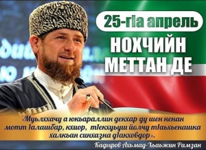 Вайна массарна а мехала деза де ду х1ара, х1унда аьлча вай декхарийлахь ду вешан мохк, мотт беза а, цуьнан сий, ларам бан а.Къоман стом бу ненан мотт, цуьнца бен хуьлийла дац вайн дахаран хазна.Нохчийн Республикин Хьалхарчу Президента, Россин Турпалхочо Ахьмад-Хьаьжас олуш ма хиллара: «Нохчийн къам дийна хиларан мокхазан ч1аг1о ю нохчийн мотт». Матто латтош ду къам, и д1атесча духу цу къоман г1иллакхаш а, оьздангаллин баххаш а.Со тешна ву, мехкан куьйгаллехь халкъах а, маттах а дог лозуш, Россин Турпалхо Кадыров Ахьмад-Хьаьжин Рамзан мел ву, къоман кхане сирла хирг хиларх!Дала т1аьхье беркате йойла вайн, ирсе дог1ийла Нохчийчохь х1ора а де!