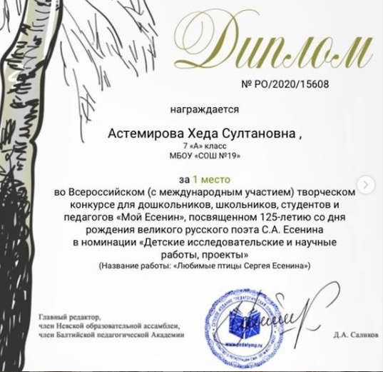 Поздравляем Астемирову Х.С., занявшую 1 место в номинации «Детские исследовательские и научные работы, проекты» и Хабибулаеву М. Э., занявшую 2 место в номинации «Литературное творчество», а также их наставника Чудиеву Карину Магомедовну, учителя русского языка и литературы. Дала т1ахье беркате йойла!
