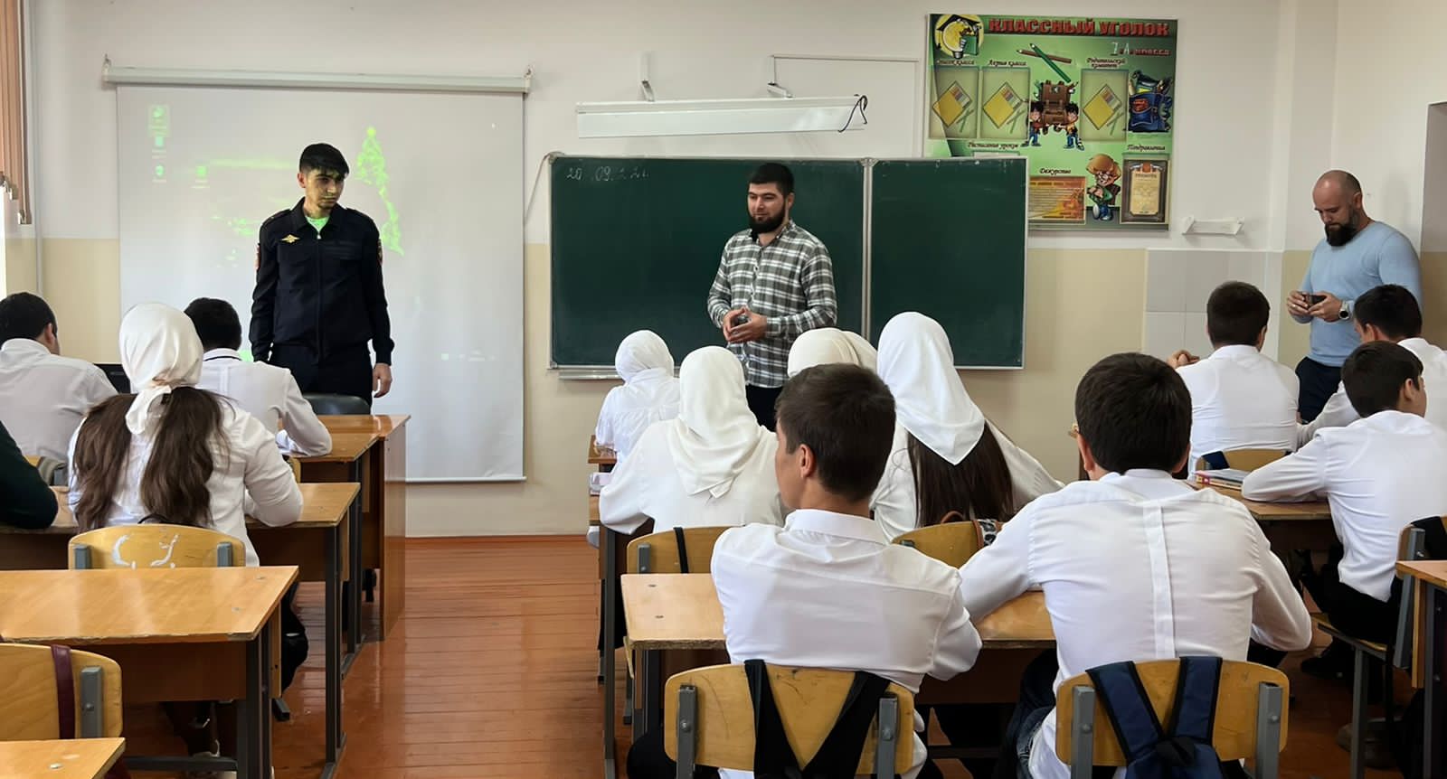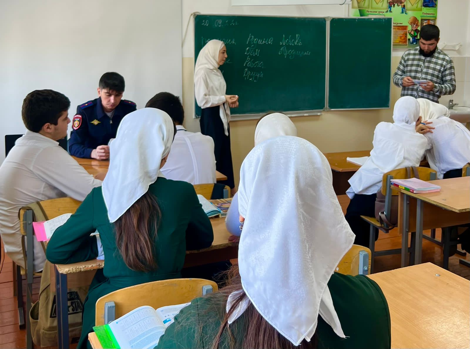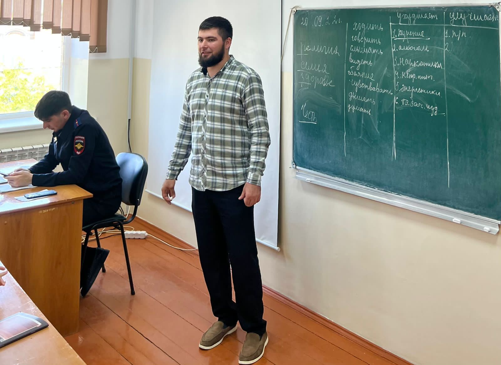 20.09.2022У обучающихся сегодня состоялась встреча с начальником отдела административных органов Префектуры Ахматовского района Эрзнукаевым М-Э. Х. и инспектором ОМВП УНК МВД по ЧР Висараговым Р.И.
