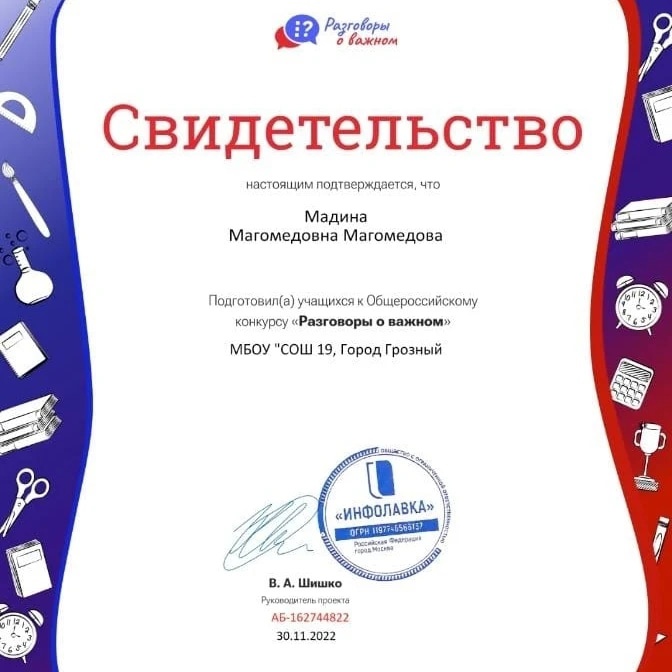 20.12.2022Во всероссийском конкурсе "Разговоры о важном" проходившем в онлайн-формате для обучающихся 1-11 классов, приняли участие обучающиеся МБОУ "СОШ 19" г.Грозного Асадулаева Амира и Асадулаева Аиша под руководством учителя Магомедовой Мадины Магомедовны.