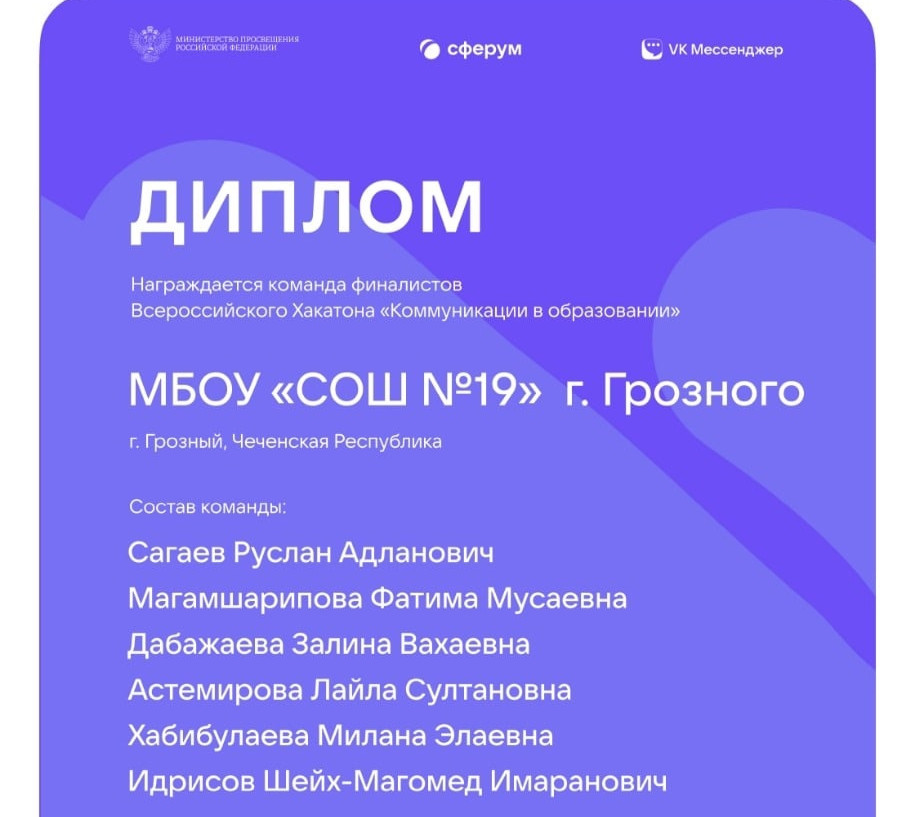 26.12.2022В рамках реализации национального проекта «Образование» 10.12.2022г. обучающиеся и педагоги МБОУ «СОШ №19» города Грозного приняли участие в финале Всероссийского хакатона «Коммуникации в образовании», организованном на образовательной платформе «Сферум» совместно с «VK Мессенджер».