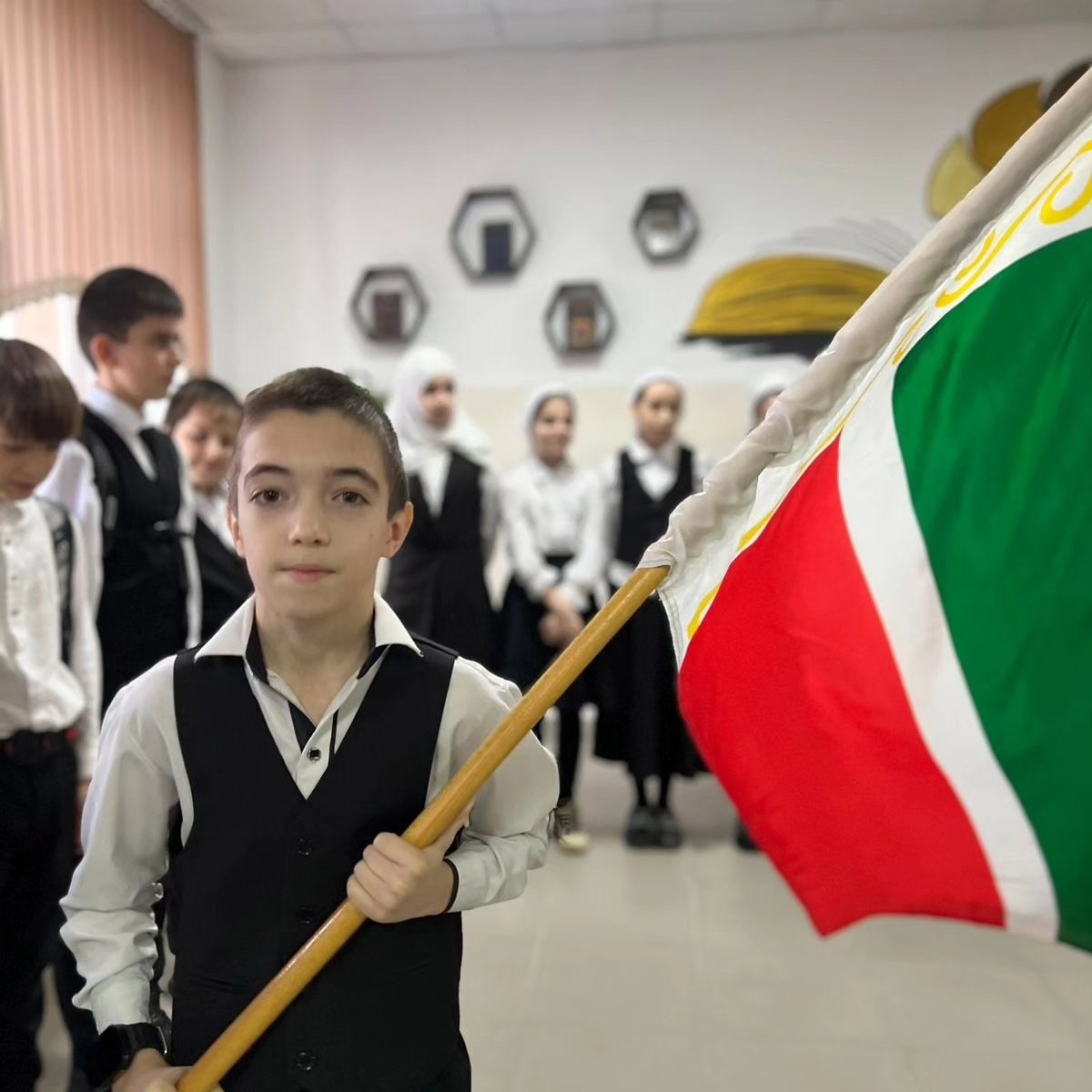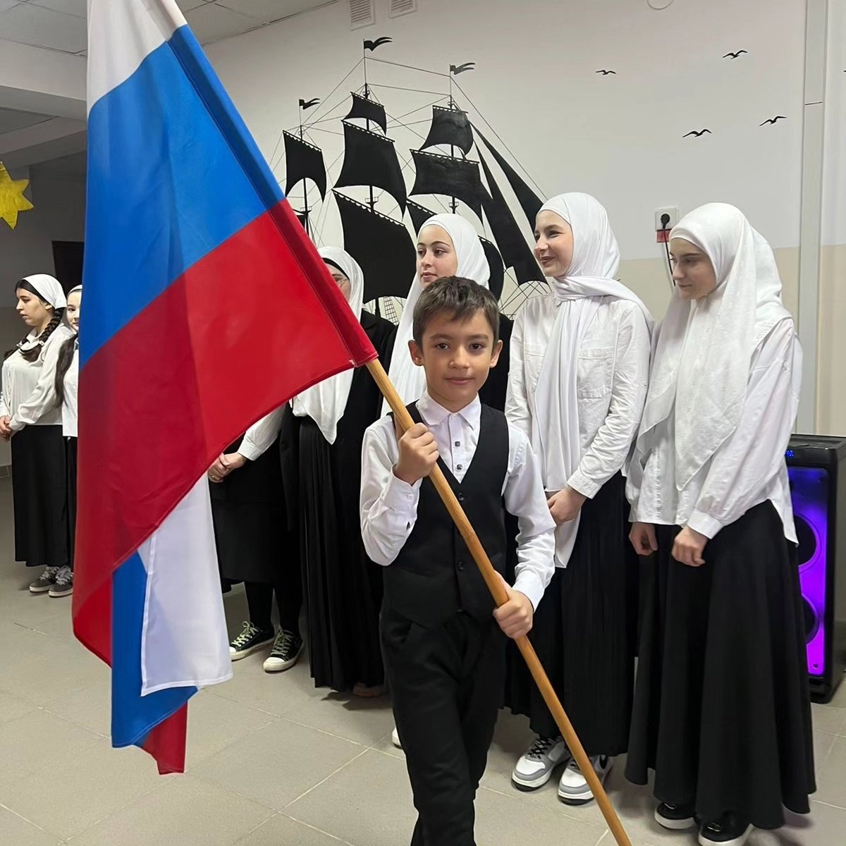 Церемония вынесения флагов и исполнение гимнов России и Чеченской Республики подчеркивает важность государственных символов и прививая чувство любви и уважения к своей стране и республике.