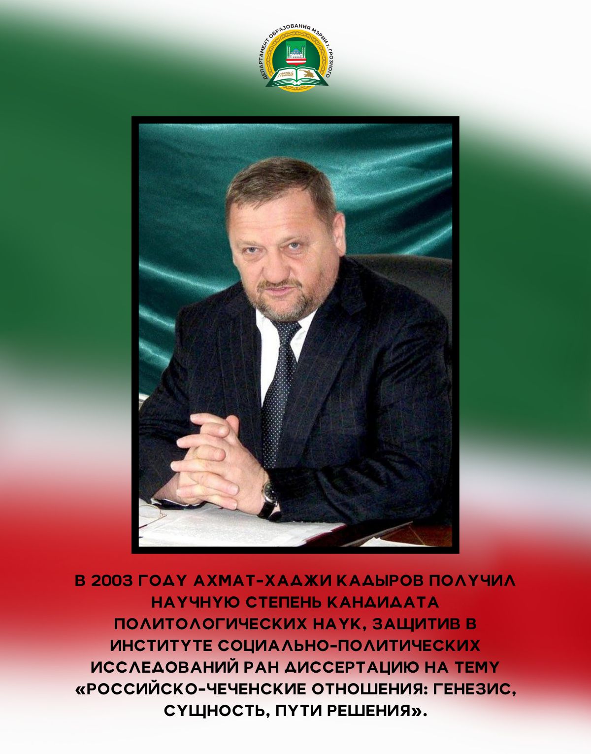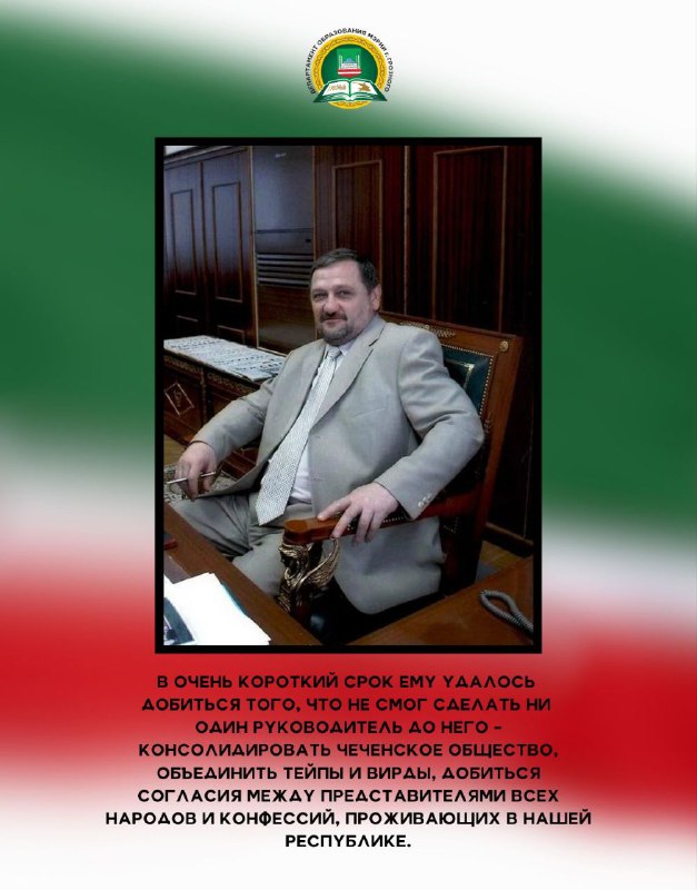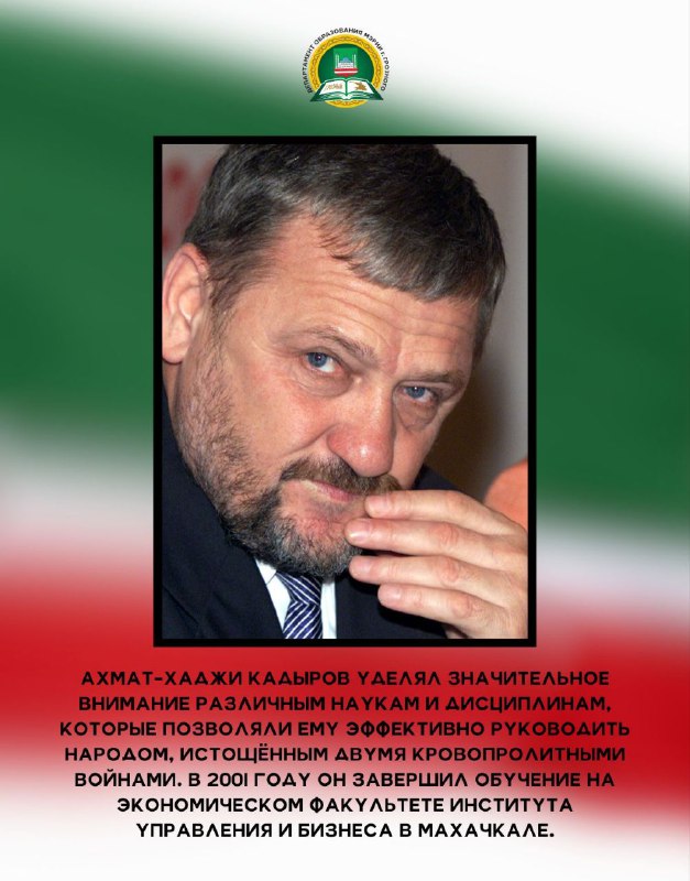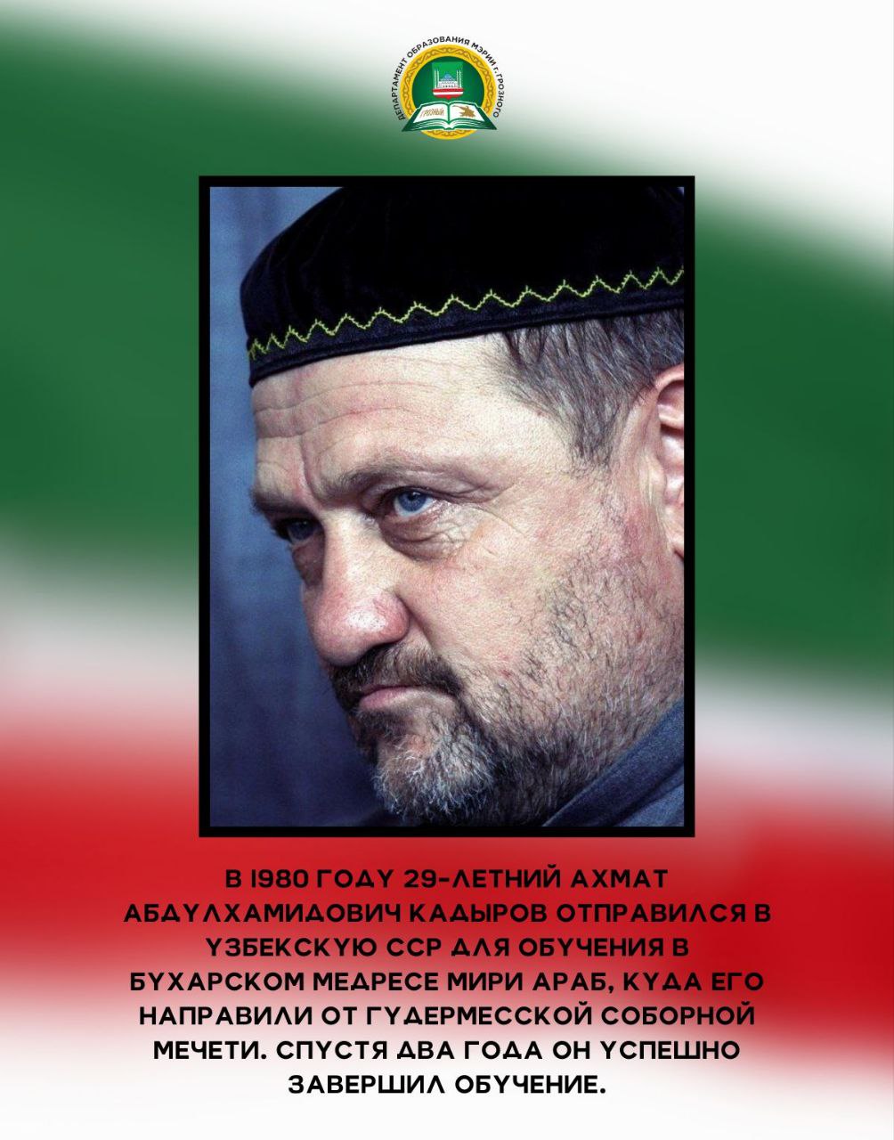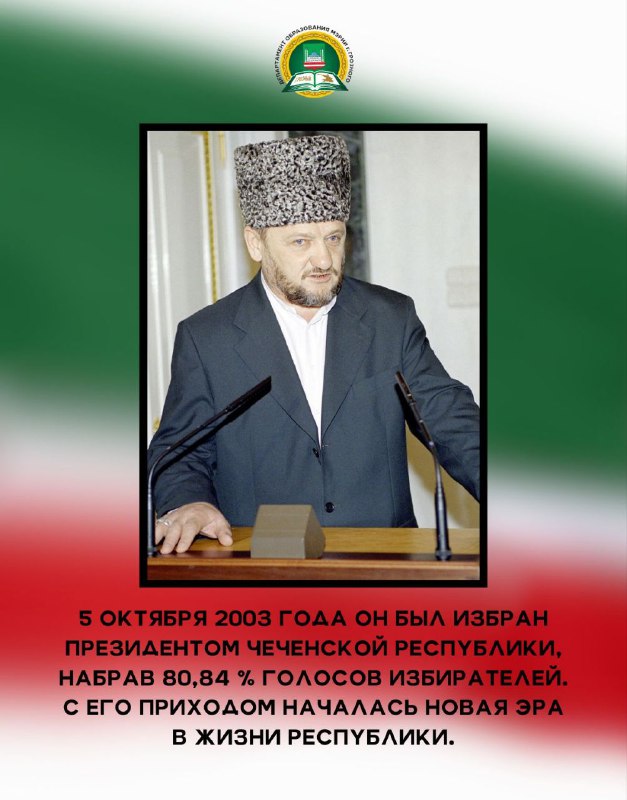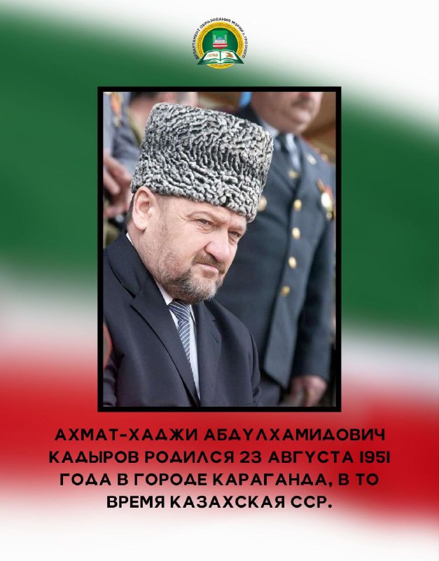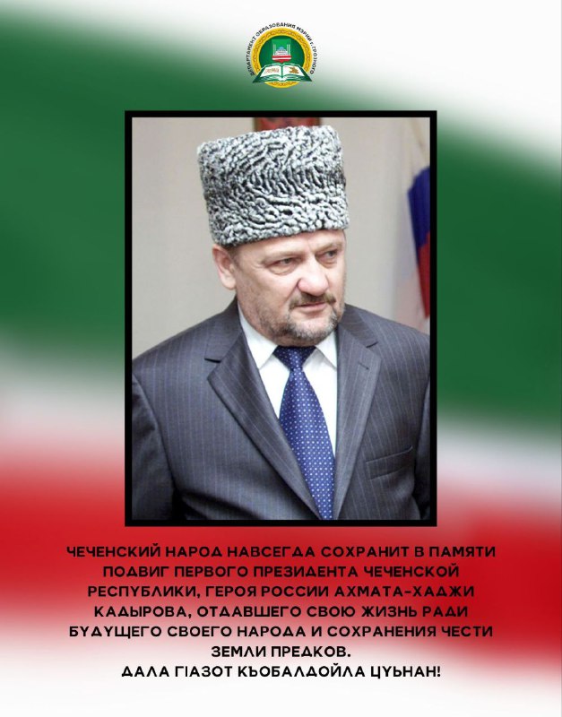 23.08.202423 августа исполнилось 73 года со Дня рождения Первого Президента Чеченской Республики, Героя России Ахмата-Хаджи Абдулхамидовича Кадырова (Дала гIазот къобалдойла цуьнан !). Он оставил неизгладимый след в истории своего народа как национальный лидер, остановивший кровопролитие и положивший начало возрождению Чеченской Республики. Департамент образования Мэрии г. Грозного подготовил для вас карточки, которые познакомят с интересными фактами из жизни Ахмата-Хаджи Кадырова - человека, посвятившего свою жизнь борьбе за мир и благополучие в регионе. Узнайте больше о том, как этот выдающийся политик и религиозный деятель изменил ход истории чеченского народа.