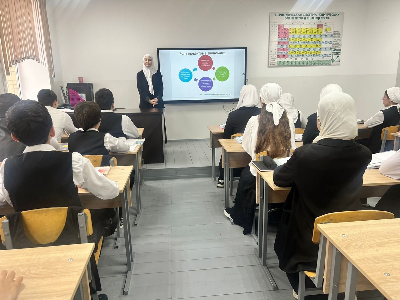 03.12.2024Учитель обществознания МБОУ «СОШ №19» г. Грозного присоединился к Всероссийской просветительской эстафете «Мои финансы». В рамках реализации Стратегии повышения финансовой грамотности и развития финансовой культуры в нашей стране Министерство финансов Чеченской Республики инициирует III этап этой важной инициативы.На недавнем уроке обществознания для учеников 9-11 классов было проведено занятие на тему «Ответственный кредит». Обучающиеся получили ценные знания о финансах, научились различать ответственный подход к кредитованию и осознали, как важно избегать финансовых ловушек. Этот урок не только углубил их понимание финансовых вопросов, но и подготовил к принятию обдуманных финансовых решений в будущем.
