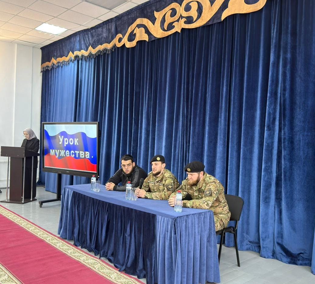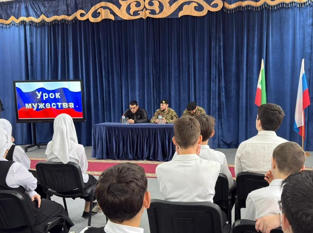 На урок были приглашены сотрудники Полка полиции имени Героя России А. А. Кадырова: лейтенант полиции, командир взвода Балатханов Рахим Расулович и инструктор по строевой подготовке Тимирбулатов Саид Зиммудинович.Гости рассказали ребятам о значимости службы в армии и полиции, важности патриотизма и ответственности перед Родиной. Основное внимание было уделено обсуждению личностных качеств, необходимых для службы в армии, а также вопросам профессиональной ориентации. Военнослужащие поделились своим опытом и рассказали, какие черты характера важны для успешной военной карьеры. Урок мужества прошёл в тёплой дружеской атмосфере. Ребята на конкретном примере увидели, что настоящие герои живут рядом, что мужество, храбрость, любовь к Родине – это качества патриота и настоящего гражданина России.Мероприятие способствовало воспитанию у школьников чувства гордости за защитников Отечества и укреплению гражданской позиции.
