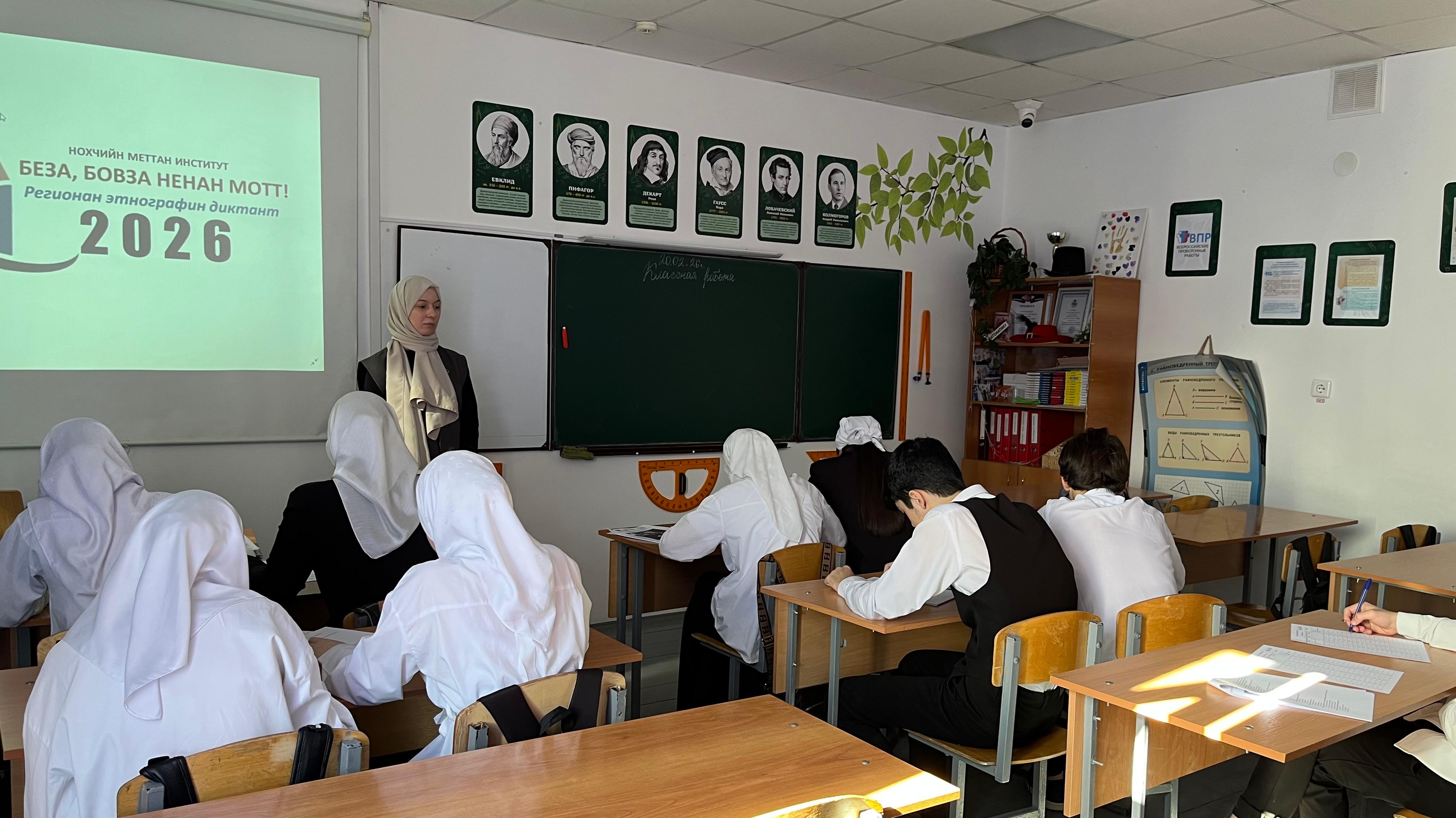 20.02.2026МБОУ СОШ №19 г. Грозного успешно прошёл Региональный этнографический диктант «Беза, бовза ненан мотт» для обучающихся в возрасте от 14 лет и старше общеобразовательных организаций города.
